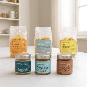 Scopri il nostro Box Colazione Siciliana: biscotti artigianali di grani antichi siciliani al limone, arancia e cioccolato, insieme a 3 creme (pistavè, mandovè, nocciovè). Un’esperienza di colazione innovativa, 100% siciliana, sostenibile e ricca di qualità.